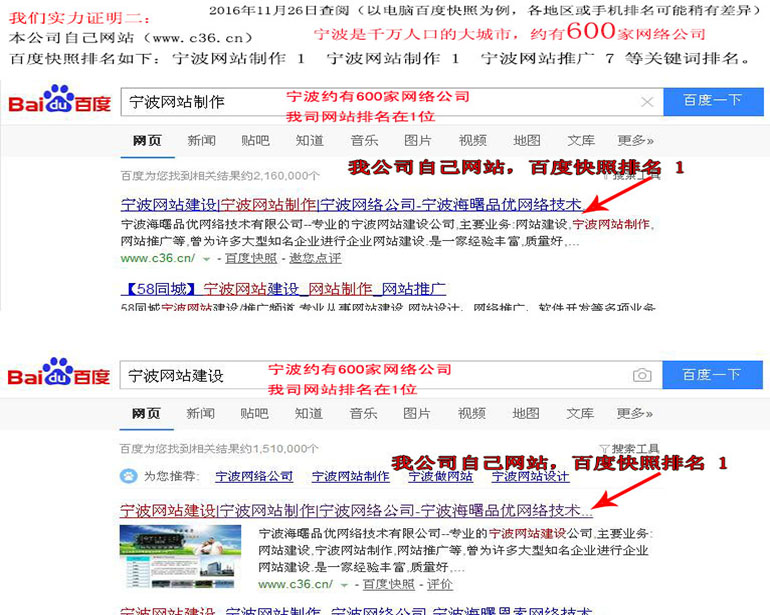 浙江省寧波市是千萬(wàn)人口的大城市,約有600家網(wǎng)絡(luò)公司,競(jìng)爭(zhēng)異常厲害,“寧波網(wǎng)站建設(shè)”“寧波網(wǎng)站制作”這二個(gè)關(guān)鍵詞,本公司網(wǎng)站多年來(lái)基本上百度快照排在第1名(360搜索也多數(shù)排名在1名)...